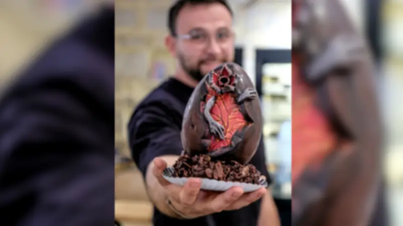"C'est l'un de mes moules, avec une ouverture au centre, qui m'a fait penser à cette série télévisée que j'aime beaucoup et à la faille d'Hawkins", explique le pâtissier. Loin du traditionnel lapin de Pâques, cet œuf a rapidement trouvé son public, notamment parmi les grands enfants et les fans inconditionnels.