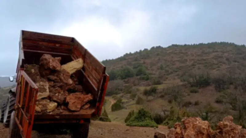 Un paysan venu du hameau voisin déverse sa cargaison d'énormes blocs rocheux transportés dans des bennes. "Ça, ce n'est pas les cailloux qui manquent ici", s'amuse Francis, l'un des bénévoles. "Il n'y a qu'à se baisser pour les ramasser." Se baisser avec une tractopelle, cependant, car la masse de ces pierres est impressionnante.