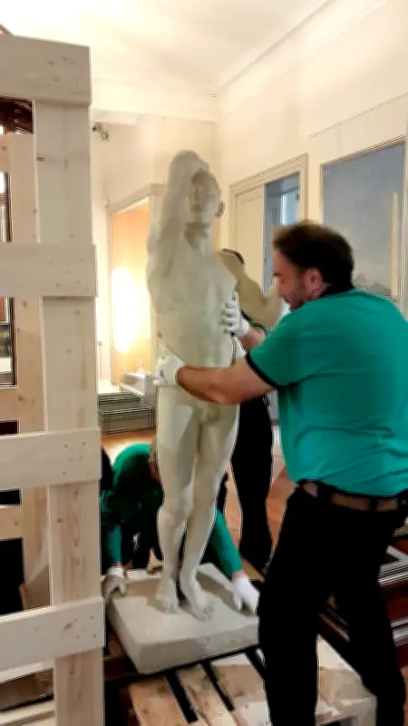 Des spécialistes d'une entreprise dédiée ont procédé à la descente de la sculpture dans sa cage de bois protectrice. "Cela a été relativement vite, en une heure environ. La phase la plus délicate fut la descente du grand escalier", explique Catherine Wachs-Genest, la conservatrice du musée. Les agents ont précisé que la statue en plâtre n'était "pas trop lourde", facilitant ainsi les manœuvres.
