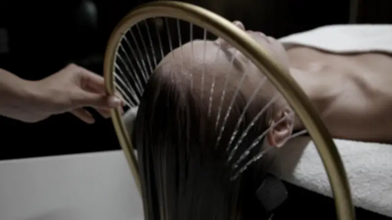 L'expérience se poursuit avec l'arrivée d'eau chaude par une arche mobile qui glisse délicatement de la naissance des cheveux jusqu'au torse. Cette technique douce crée une sensation de bien-être immédiat tout en préparant le cuir chevelu aux soins suivants.