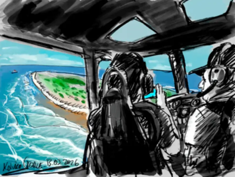 La vue du ciel est splendide. Le « Marion-Dufresne », dans son intégralité, claque sa robe tricolore sur un fond d’océan outremer cobalt à l’horizon incliné puis la longue bande sableuse tachetée de vert mousse se déplie, se déploie, bordée de turquoise et d’écume.