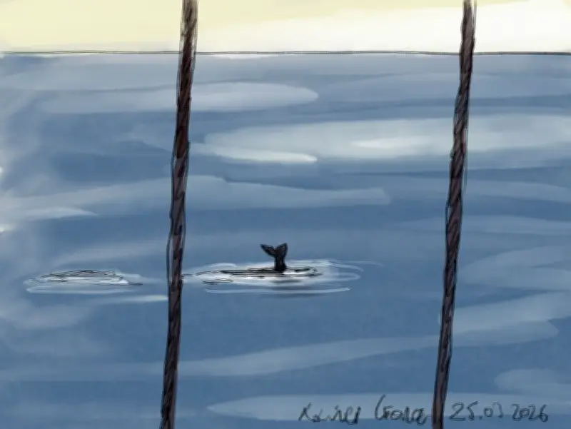 En direction de l'embouchure de la baie, des brumes soufflées signalent la présence de baleines. Elles se rapprochent progressivement. Des remous de surface trahissent une émergence imminente, puis un dos apparaît qui lâche un jet avant de disparaître.