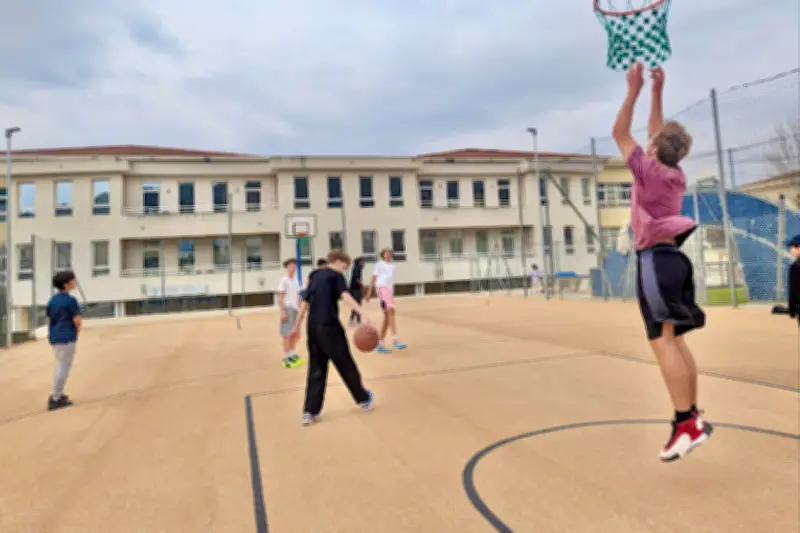L'ancien terrain de football en stabilisé a laissé place à une enceinte multisport équipée de gazon synthétique et de filets pare-balles. Le terrain de basket a été déplacé et recouvert d'un revêtement clair et drainant, spécifiquement conçu pour limiter la chaleur estivale et favoriser l'écoulement des eaux de pluie.
