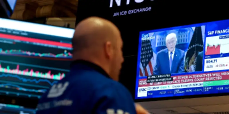 Un trader du New York Stock Exchange, devant un écran diffusant la conférence de presse de Donald Trump depuis la Maison Blanche, le 20 février 2026. Du Royaume-Uni à l'Union européenne en passant par le Mexique, les partenaires commerciaux des États-Unis ont réagi avec une grande prudence au camouflet infligé, vendredi 20 février, par la Cour suprême à Donald Trump. La haute juridiction a en effet déclaré illégaux une grande partie des droits de douane que l'ancien président avait instaurés durant son mandat.