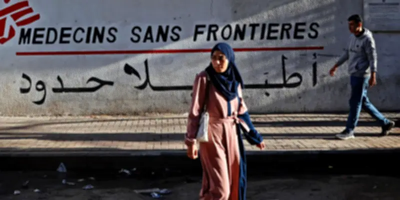 Devant la clinique de Médecins Sans Frontières (MSF) dans le quartier de Rimal, à Gaza, le 11 janvier 2026, l'atmosphère était tendue alors que le sort de plusieurs grandes organisations non gouvernementales (ONG) internationales actives dans la bande côtière en ruines était en suspens. La Cour suprême israélienne a accordé, vendredi 27 février, un sursis à 17 d'entre elles, ainsi qu'à un forum d'ONG, qui avaient déposé un recours pour invalider l'ordre de cesser leurs activités à compter du dimanche 1er mars.