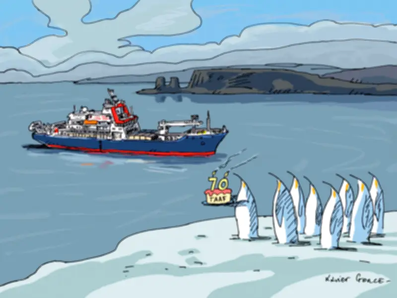 Aujourd'hui, invité par la préfecture des Terres australes et antarctiques françaises (TAAF) – pour qui j'ai réalisé l'an passé la carte de vœux 2025, marquant le 70e anniversaire de la création de cette entité administrative –, je vais monter à bord du Marion-Dufresne, affectueusement surnommé ici le « Marduf », pour une rotation d'une pleine durée.