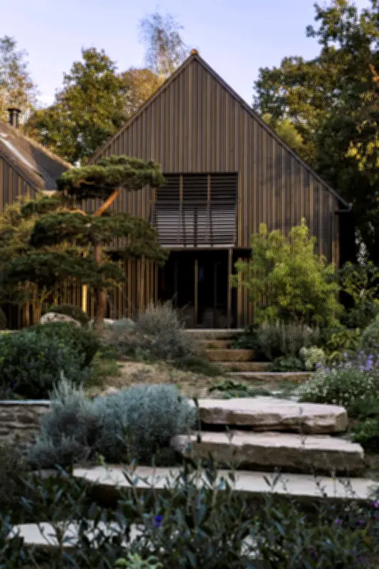 La salle dédiée aux cours de yoga et aux formations a été agrémentée de grandes ouvertures offrant une vue panoramique sur la nature environnante, telle une toile vivante. La façade en tôle, peinte en foncé pour rappeler le brai utilisé traditionnellement par les Bretons, évoque les bardages à tasseaux et les hangars à tabac de la région. Gwenn Libouban se souvient avec amusement comment sa famille a été surnommée « famille Soulages » après avoir repeint la maison en noir profond un été. « Nous avons compris que l'approche la plus écologique consiste à conserver autant que possible l'existant », confie-t-elle.