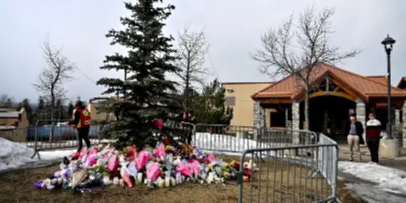 Devant l'école secondaire de Tumbler Ridge, en Colombie-Britannique, le 12 février 2026, les fleurs et les bougies s'accumulent en mémoire des victimes. Dans ce village canadien, Jesse Van Rotselaar, un jeune homme de 18 ans, a commis un massacre le 10 février, abattant d'abord sa mère et son demi-frère, puis ouvrant le feu dans l'établissement scolaire.