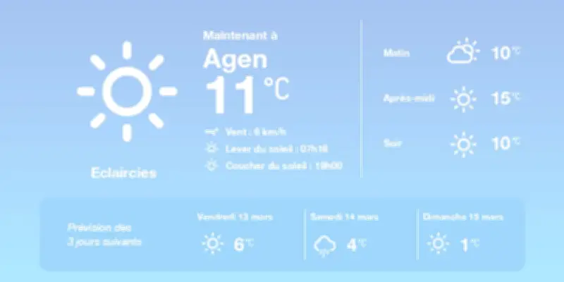 En résumé, la météo à Agen s'annonce favorable avec des températures douces et des éclaircies, bien que le brouillard et quelques averses puissent ponctuer les nuits et soirées. Restez informés pour adapter vos activités en conséquence.