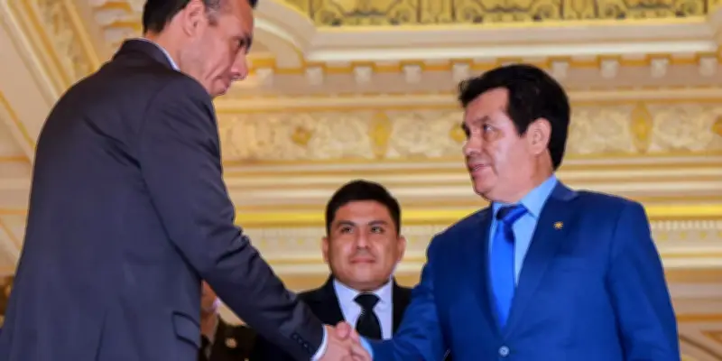Cette photographie fournie par la présidence péruvienne montre l'ancien président péruvien José Jeri, situé à gauche, serrant la main du procureur général, Tomas Aladino Galvez, au palais du gouvernement, à Lima, le 30 janvier 2026. L'image illustre un contexte politique tendu, marqué par des tensions au sein des institutions judiciaires.