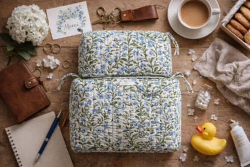 Réalisée en block print selon la tradition indienne, cette trousse en coton imprimée à la main offre un cadeau unique et raffiné. Molletonnée à l'extérieur et dotée d'une doublure imperméable, elle allie esthétique et praticité avec des poches intérieures bien pensées. Un objet d'art du quotidien pour les nounous sensibles à l'artisanat.