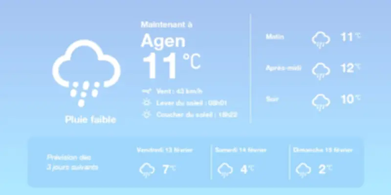 Les habitants d'Agen doivent s'attendre à une journée marquée par des conditions météorologiques changeantes. Des pluies sporadiques sont prévues pour aujourd'hui, avec des précipitations qui devraient être diffuses sur l'ensemble de la région. La température affichera des valeurs comprises entre 9°C au minimum et 12°C au maximum, indiquant un temps frais mais relativement doux pour la saison.