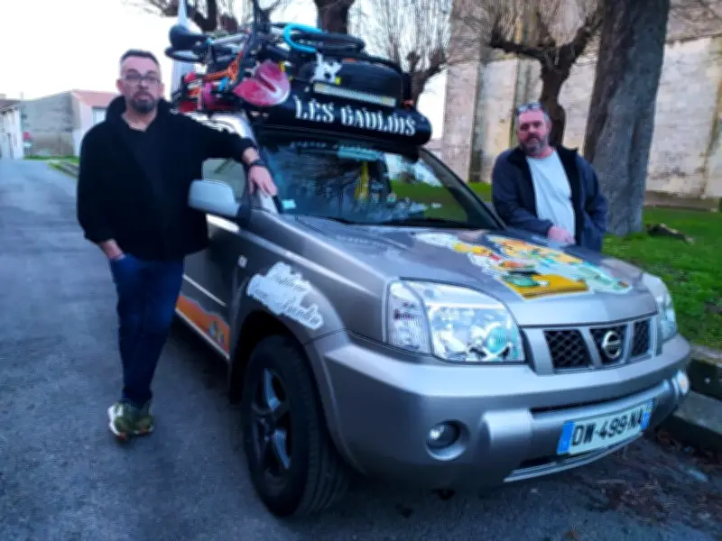 Stéphane et Eric sont amis depuis toujours, étant nés et ayant grandi à Pérignac. Stéphane est cuisinier à Cognac, tandis qu'Eric est tailleur de pierre à Pérignac, d'où leur surnom les Pérignacais 16 17. Ils évoquent leur voyage de l'an passé comme un bon petit périple, réalisé avec un Citroën Berlingo. Pour cette édition 2026, ils optent pour un Nissan X-trail, offrant un peu plus de confort et de place, bien que ce véhicule ait toute une histoire.