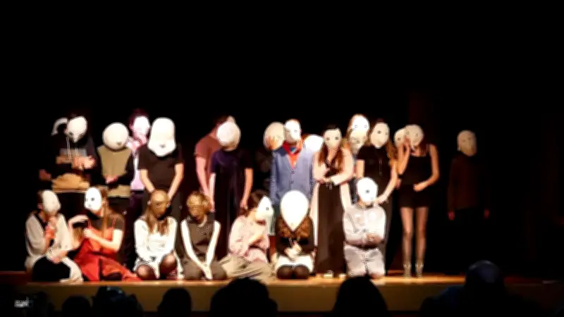 Il s'agissait en l'occurrence de petites saynètes de la vie quotidienne dans lesquelles les jeunes artistes apparaissaient masqués, avec leurs corps pour seul moyen de communication. Comme leur ont expliqué avec insistance les deux comédiens : « sous le masque, on ne parle pas ». L'accompagnement sonore a été réalisé par les élèves à l'aide de bruitages, de sons divers et variés ainsi que d'un accordéon, qui a souligné et renforcé l'action des élèves sur la scène.