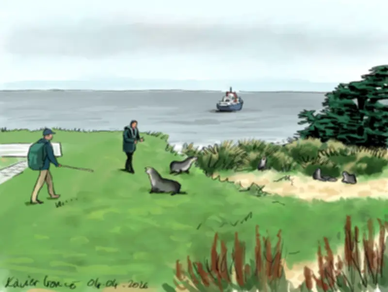 Les héliportages de retour reprennent mais il faut d’abord chasser les otaries qui trouvent la dalle de la drop zone à leur goût, on se demande bien pourquoi. Les panneaux d’au revoir et les mises en scène de départ burlesques ritualisent à nouveau ce moment si particulier, cette fois le dernier de l’OP1 2026, qui mêle joies du retour et tristesses des séparations. Adieux aussi, les pups (bébé otaries) et leurs mamans. Et direction La Réunion pour 4 ou 5 jours de mer.
