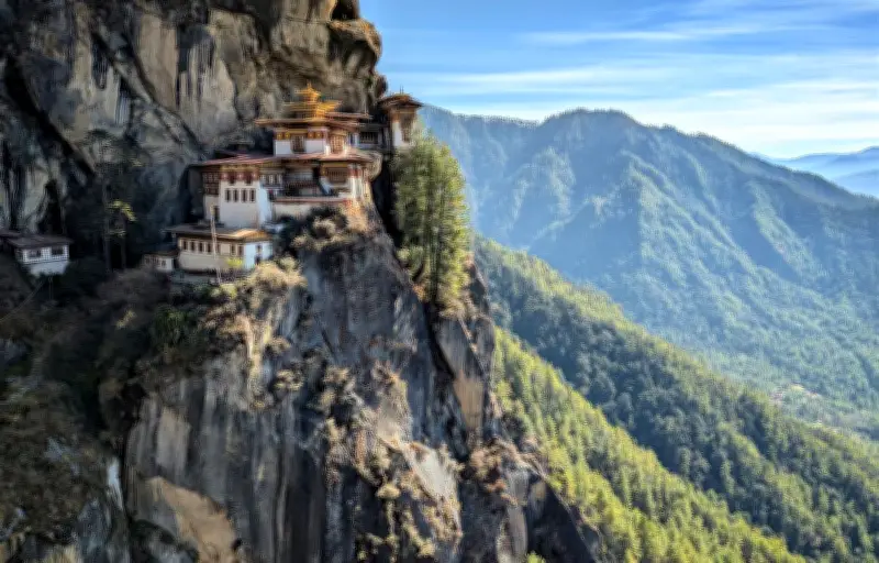 Pour les phobiques de l'avion, l'approche de l'aéroport de Paro au Bhoutan constitue une véritable épreuve de courage. Jusqu'aux derniers instants, les montagnes imposantes semblent défier toute tentative d'atterrissage. L'appareil effectue des virages serrés pour contourner les sommets, tandis que les forêts denses défilent à hauteur des hublots. Ce n'est qu'au dernier moment que la vallée de Paro se révèle enfin, avec sa piste courte et encaissée entre rizières et rivière. Ici, aucune marge d'erreur n'est permise, rien n'a été conçu pour faciliter l'arrivée.