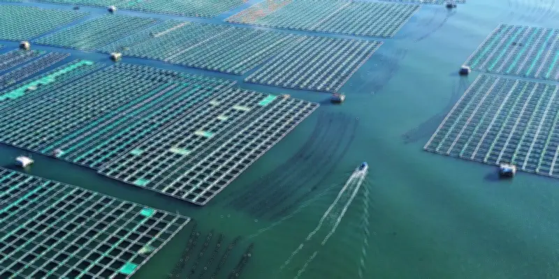 Une ferme marine située à Rongcheng, dans la province du Shandong en Chine, photographiée le 13 novembre 2025, illustre la dépendance des activités humaines envers les écosystèmes naturels. WANG FUDONG/XINHUA VIA AFP