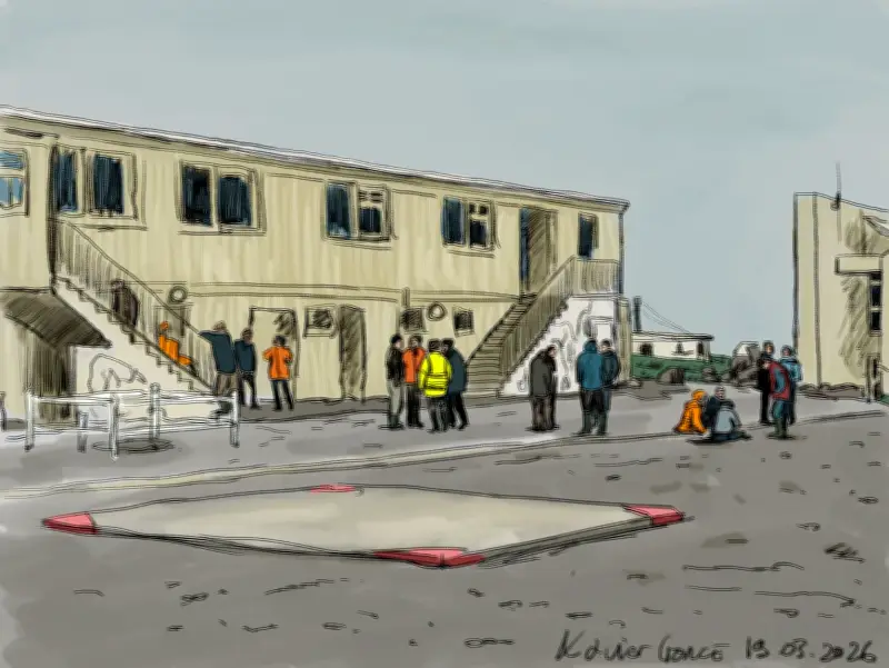 À 7h30, depuis le perron de la « Résidence », je distingue à peine à cent mètres dans le brouillard épais le bâtiment de vie où nous avons dîné et passé la soirée la veille. Cette visibilité réduite n'annonce rien de bon pour les opérations de déchargement.