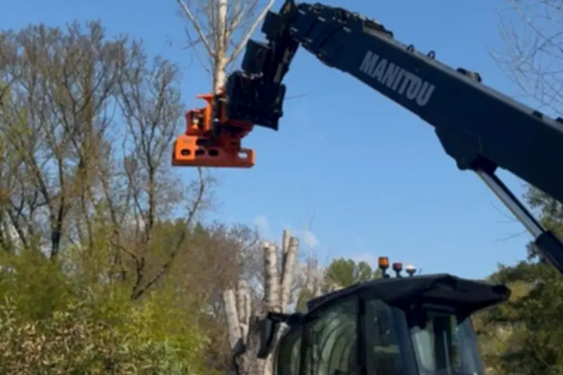 L'opération a été réalisée à l'aide d'un chariot télescopique équipé d'un bras articulé muni d'une pince et d'une scie forestière. Particularité notable : l'engin était téléguidé depuis le sol grâce à une télécommande, permettant d'exécuter les travaux dans un calme remarquable où seul le chant des oiseaux était perceptible. Cette approche a minimisé les nuisances sonores tout en garantissant une précision optimale dans les interventions.